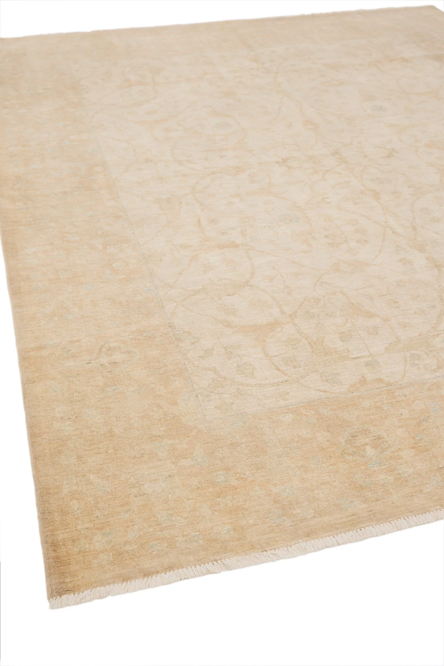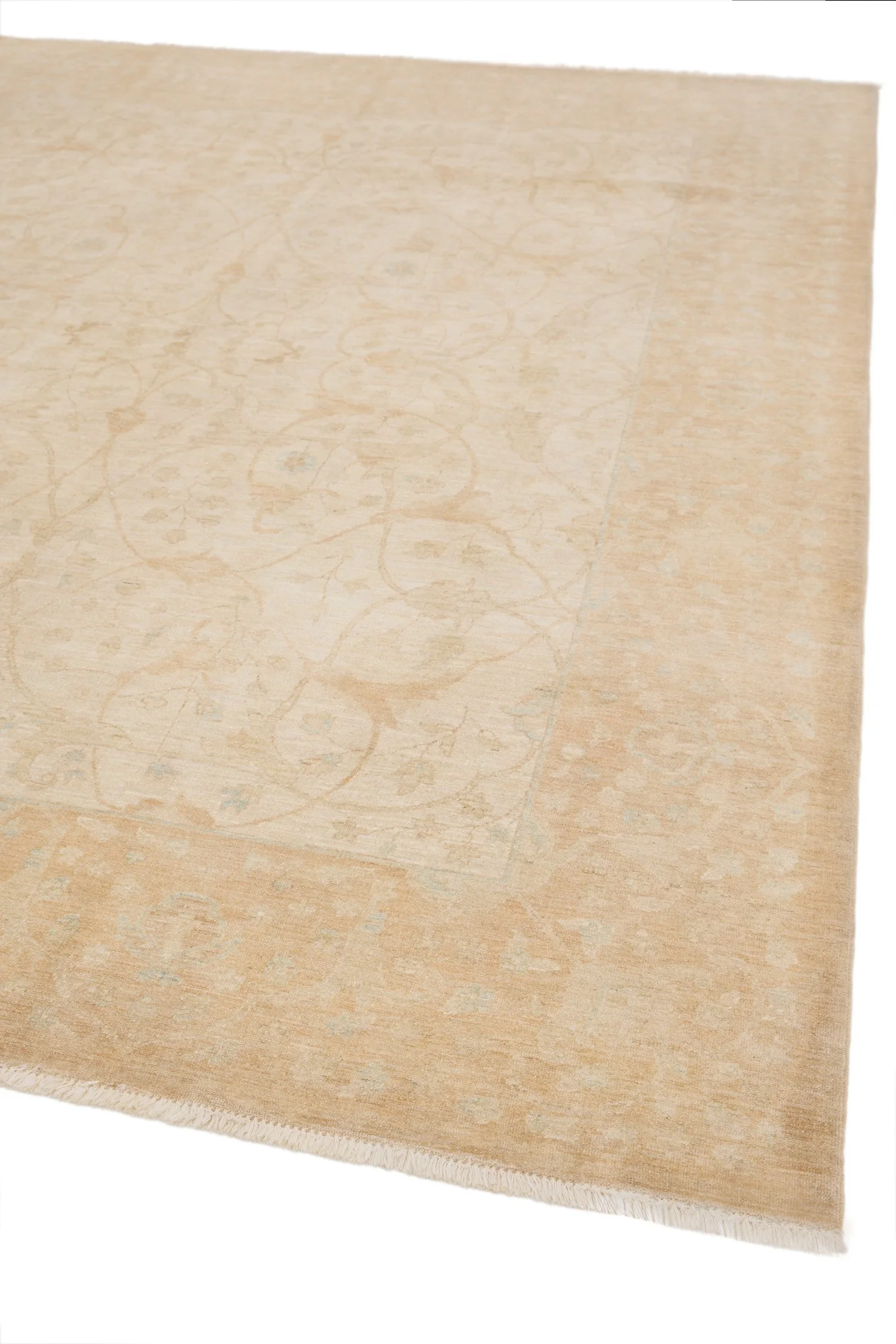 At 9'6" x 12'7", this rug brings substantial presence to living spaces, dining areas, or bedrooms where scale matters. The muted palette of beige, faded blue, and blush pink works within interiors that favor soft, romantic color schemes, while the watercolor-like quality brings an artistic sensibility that complements spaces with gallery walls or collected furnishings. Its aged patina makes it particularly effective in rooms that blend vintage and contemporary elements, where the rug's history adds authenticity without demanding period-appropriate surroundings.