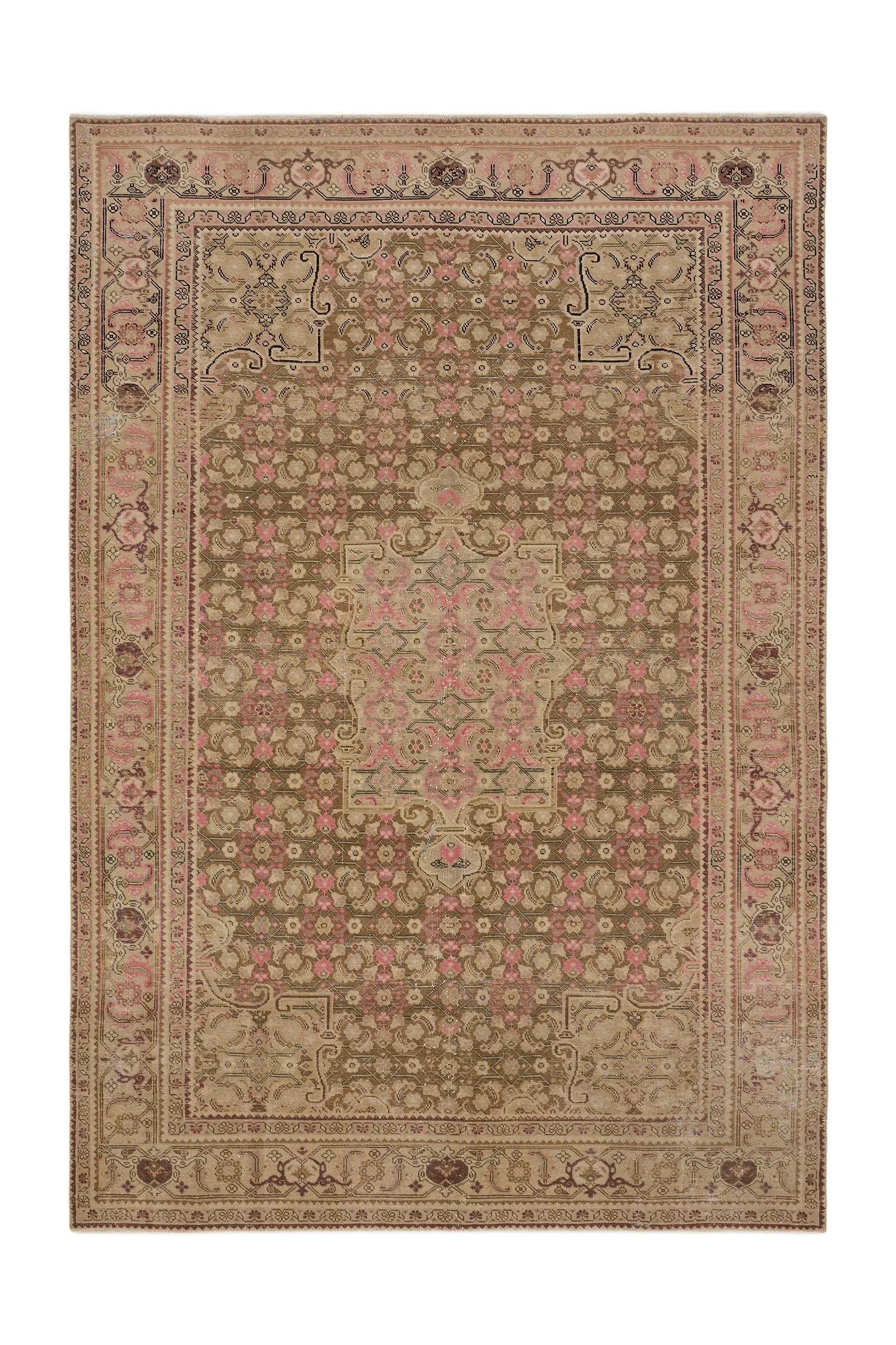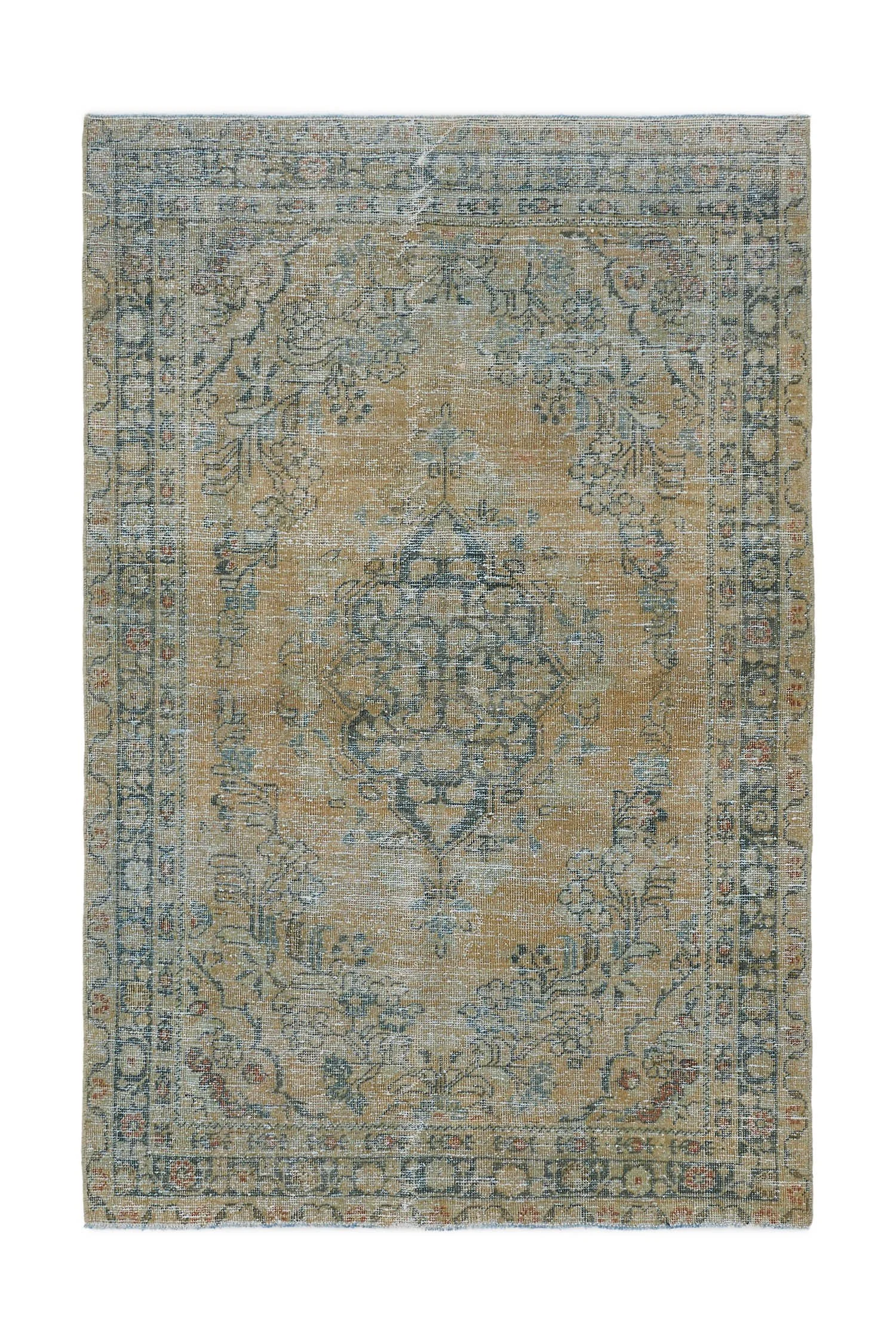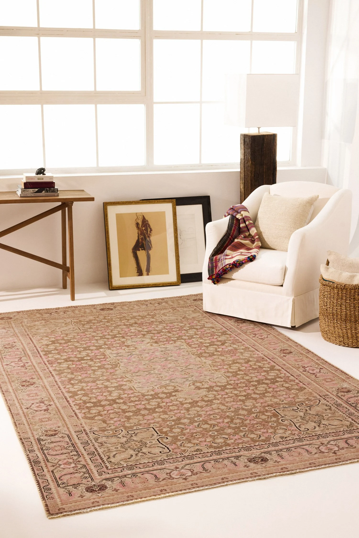 At 6'9" x 9'9", this rug suits living rooms, dining areas, or bedrooms where moderate scale works with the architecture. The muted palette of taupe, walnut, and slate blue integrates into varied interior approaches, from spaces embracing traditional furnishings to those leaning toward contemporary aesthetics. The angular geometry brings visual structure to rooms, its graphic quality providing definition without overwhelming. The naturally aged patina makes it effective in interiors mixing periods and styles, the rug's softened character bridging different design languages.