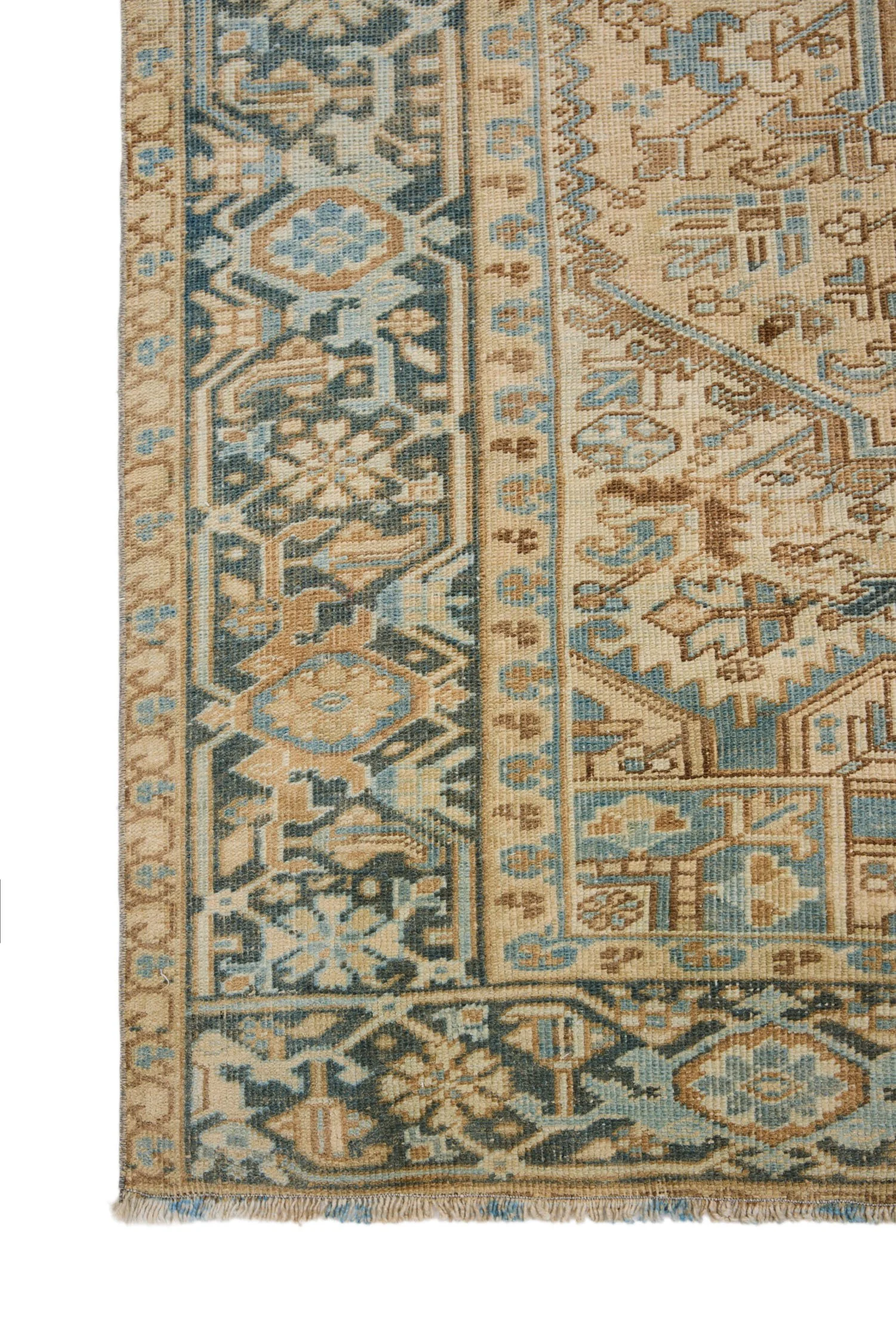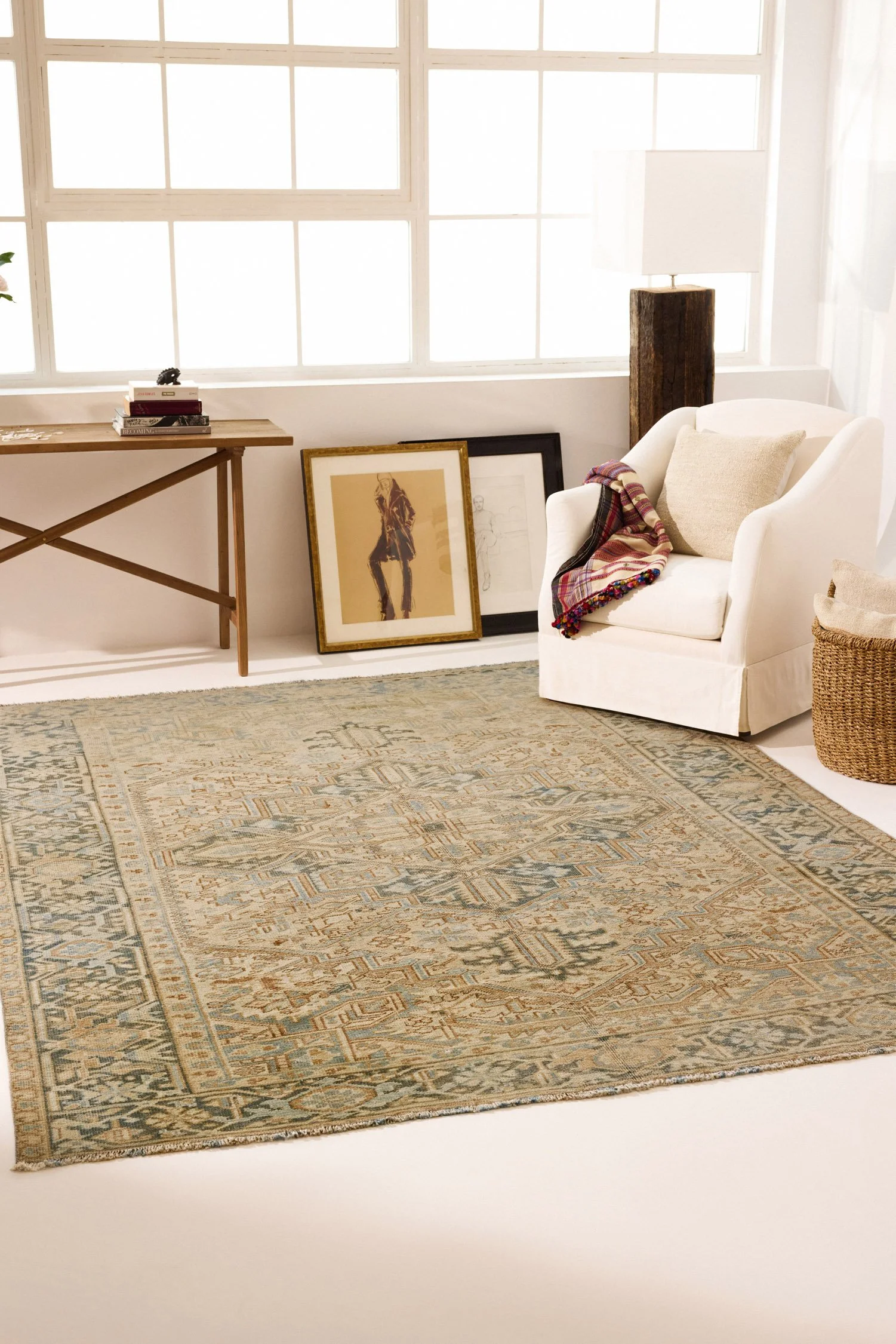 At 4'1" x 7'3", this prayer rug works in entryways, beside beds, in meditation or yoga spaces, or as a wall hanging where its architectural composition displays vertically. The warm palette of rust, ivory, and olive brings earthiness to spaces with neutral surroundings. Its compact size suits apartments, powder rooms, or defining intimate zones within larger spaces. The symbolic tree and floral motifs add layers of meaning for those drawn to textiles with spiritual significance, while the strong geometric structure and warm coloring work effectively in varied interior contexts from traditional to eclectic.